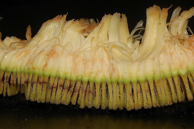 This Timadang fruit is just ripe and really nice to eat at this stage. This fruit belong to the medium sized 'tarap', measured at average of 8 -10 inches long and 6-8 inches across. Bigger fruit type is larger than a foot long. This one, the smell is not identifiable yet. Try beating lightly with your palm and a low thud sound is produced. The taste is a hints of warm cool sour and sweet. When left to ripe for the next day the smell is clear and identifiable as ripening Timadang notes. Left for the midday and the smell travel further, yet and another days, the smell is unbearably suffocating, seriously.